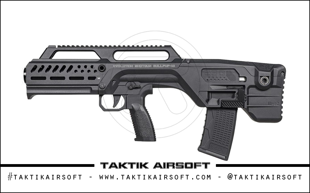 Eine einzigartige Bullpup-Schrotflinte auf dem Airsoft-Markt, hergestellt von G&G, Diese futuristische Waffe bietet eine kompakte Plattform voller Feuerkraft. Eine Gasfüllung reicht aus, um herumzufeuern 70 rundet optimal ab, und es kann sie auch abfeuern 5 Runden bzw 10 Runden auf einmal – Das Wechseln zwischen den Modi ist ein einfacher Wechsel eines beidhändigen Wahlschalters. Die Schrotflinte wird von Standard-M4-AEG-Magazinen gespeist – da das Gas intern gespeichert ist, Dies bedeutet nicht nur eine weitverbreitete Verfügbarkeit von Magazinen, sondern auch die einfache Umrüstung der Waffe in ein HPA-System, falls Sie dies wünschen, da sich das Gasventil praktischerweise unten am Schaft befindet.