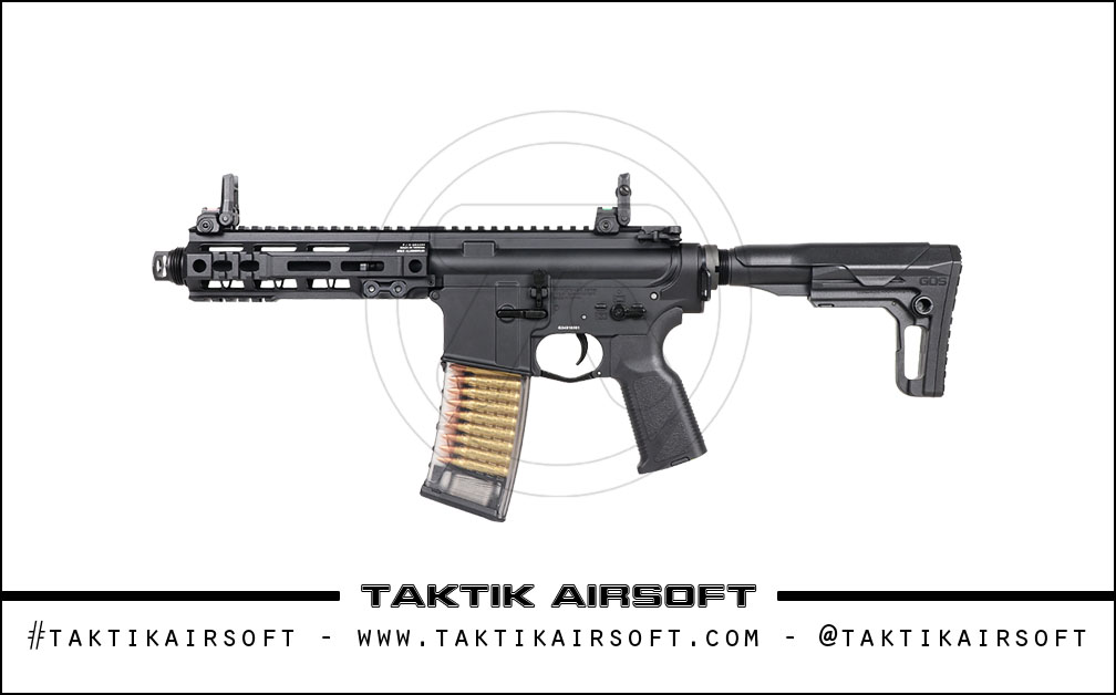 Die TR16 GMS-Serie verfügt über eine M4-Plattform mit Vollmetallgehäuse und beidhändigen Bedienelementen sowie einen modernen M-LOK-Handschutz. Die Ersatzvisiere aus Eisen haben ein Doppelprofil mit Glasfaseroptik im Pistolenvisierstil. Der GOS-V15-Schaft ermöglicht ein leicht zugängliches Batteriefach.