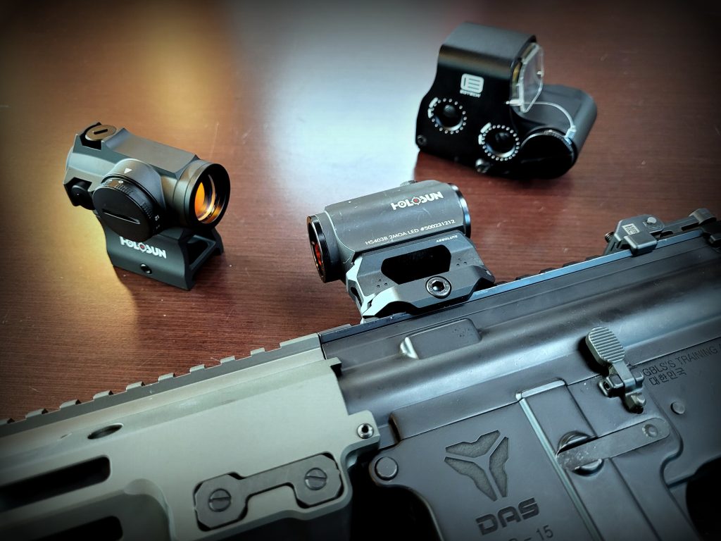 Généralement, le premier accessoire que nous recommandons après l’achat de votre airsoft serait un point rouge décent. La réplique du EXPS3 à droite est un excellent choix pour quelque chose avec un objectif clair, une bonne luminosité, à un prix décent. Mais si vous utilisez une plate-forme à recul comme un GBBR, un ERG ou même un DAS, nous vous recommandons fortement de choisir un Holosun comme les 403R ci-dessous.