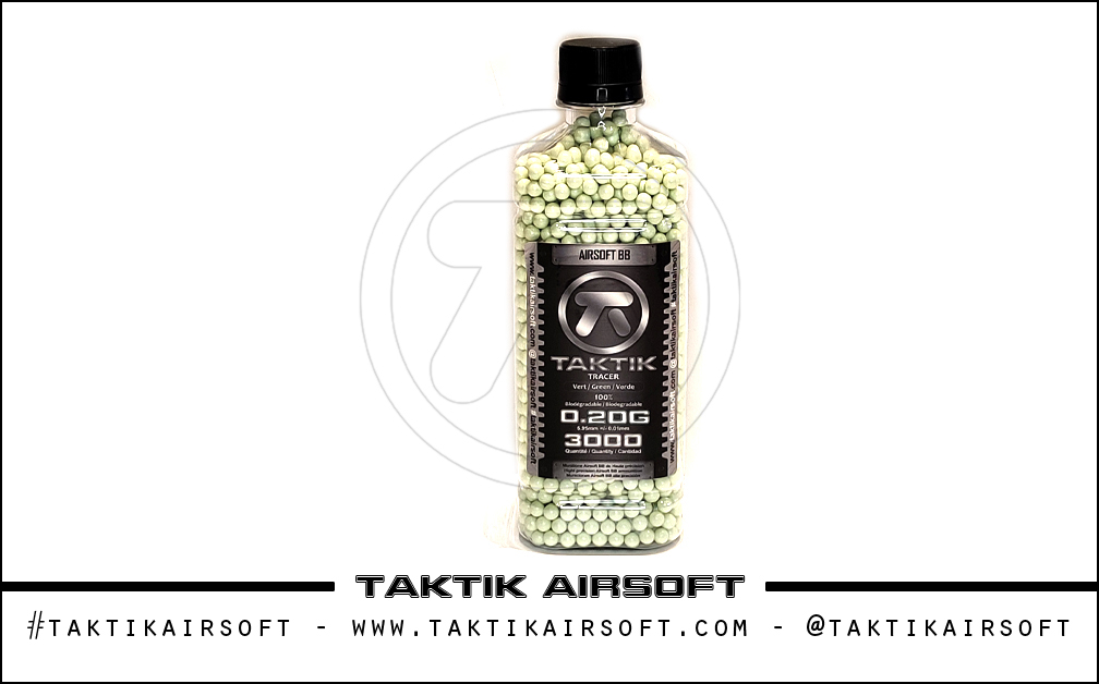Taktik’s own 0.20g tracer biodegradable BB. Viene en una botella compacta que contiene 3000. La selección cuidadosa del fabricante y el proceso de producción permite que nuestro producto sea comparable con otras marcas confiables de la industria sin dejar de ser respetuoso con el medio ambiente..